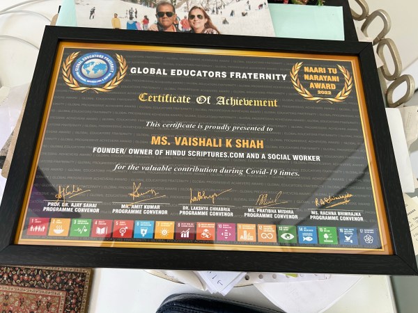 Global Educators Fraternity awarded Dr Vaishhali K. Shah with two awards in a ceremony held in Mumbai. One award was given for the social work done to uplift the African communities and Indian diaspora living in Kenya.