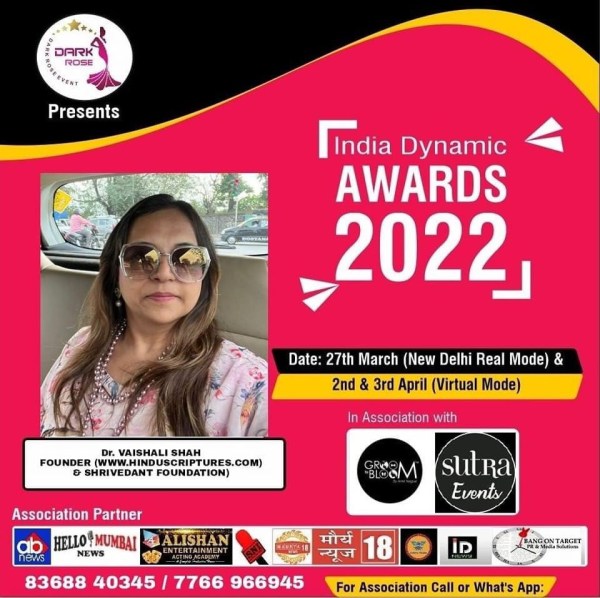 Sutra events based in Delhi awarded Dr. Vaishali K. Shah with India Dynamic awards on 27th March 2022 in New Delhi. She was awarded for her research website http://www.hinduscriptures.com.
